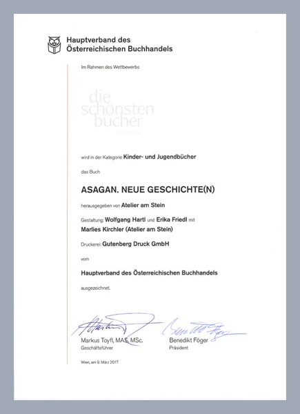 Papier: Multi Art Silk, 130 gr.; Multi Offset, 140 gr., Naturpapier <link http: www.gutenberg-druck.at external-link-new-window external link in new>Die Druckerei Gutenberg Druck erzielte beim Wettbewerb „Die schönsten Bücher Österreichs 2016“ in der Kategorie Kinder- und Jugendbücher den 1. Platz.
