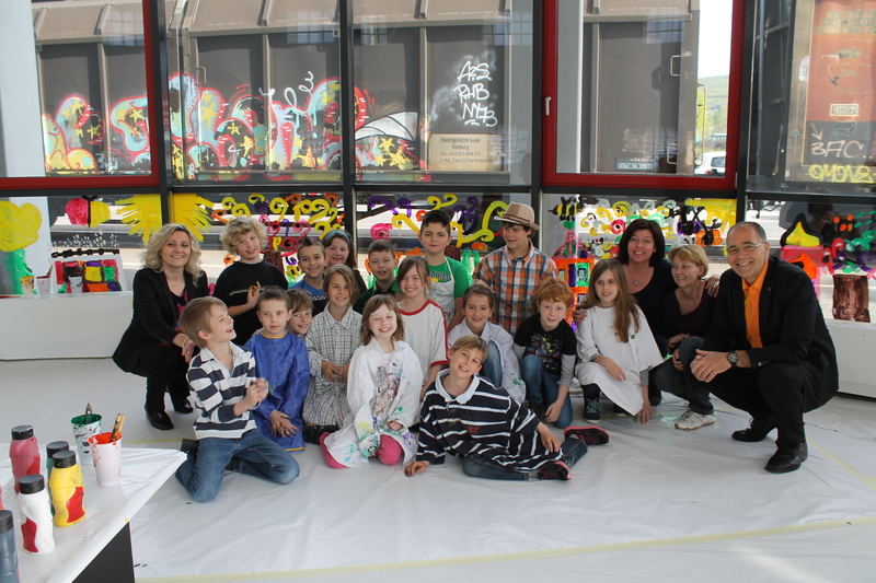 16 Kinder der dritten Klasse Volksschule in Müllendorf haben Ihrer Kreativität freien Lauf gelassen: auf Einladung der Unternehmensleitung durften sie den Eingangsbereich des Firmen-Standortes der Leykam Let’s Print in Müllendorf bemalen.
